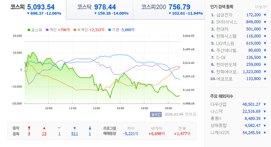 - '블랙 웬즈데이' 코스피 12% 폭락, 5000선 위협...역대 최대 하락률·낙폭 경신