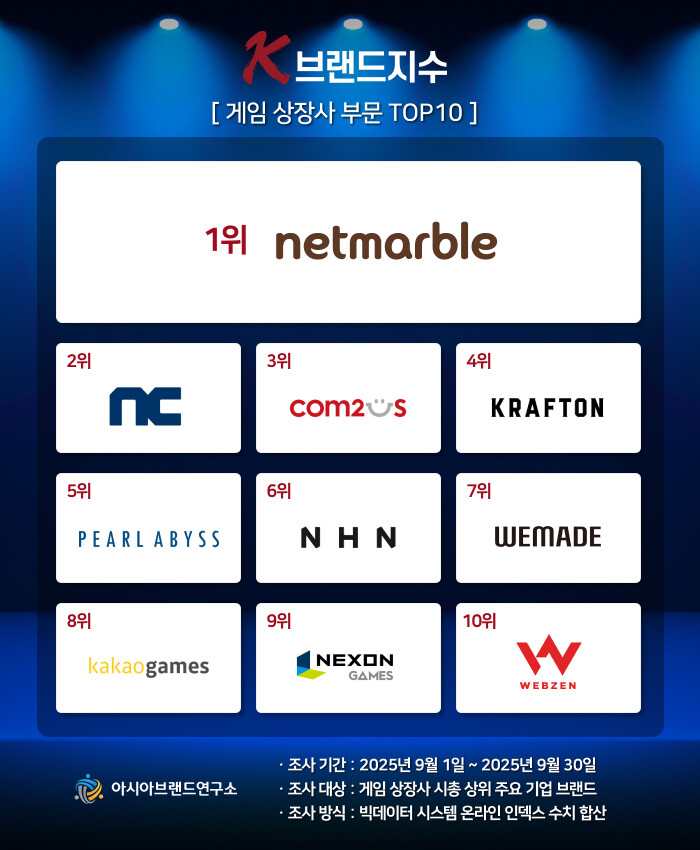 K-브랜드지수 게임 상장사 부문은 1위 넷마블에 이어 엔씨소프트(2위), 컴투스(3위), 크래프톤(4위), 펄어비스(5위), NHN(6위), 위메이드(7위), 카카오게임즈(8위), 넥슨게임즈(9위), 웹젠(10위)이 TOP10에 이름을 올렸다.