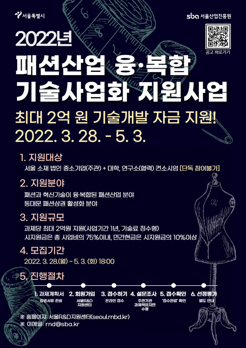 ‘2022년도 패션산업 융·복합 기술사업화 지원 사업’은 서울산업진흥원 서울R&D지원센터 홈페이지를 통해 오는 5월3일 오후 6시까지 참여 희망 기업을 접수받는다.