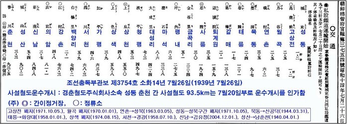 경춘철도의 화천, 인제, 양양 등 까지 연장운동이 계속되는 가운데 1937년 5월 착공하여 공사비 1,400여만 원과 연인원 260만 명이 투입되어 성동~고상전~월곡~연촌~묵동~태릉~갈매~퇴계원~사릉~금곡리~평내~마석~대성리~청평~상천~상색~가평~서천~백양리~강촌~의암~신남~성산~춘천 간 93.5㎞의 경춘선이 완공됨으로서 1939년 7월23일 개통식에 이어 24일부터 영업이 시작되었으며, 8월부터는 퇴계원 약 4만평의 부지에 운동장과 유원지를 건설하여 주말 등에는 경성~퇴계원 간 임시열차가 운행되기도 하였다.