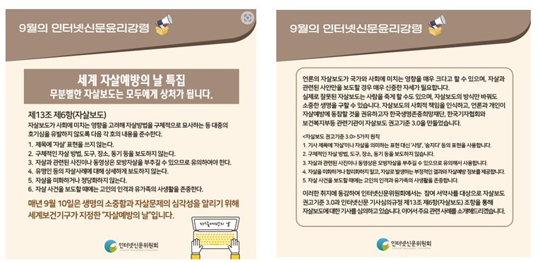 인신위는 800여 인터넷신문 서약사를 대상으로 ‘무분별한 자살보도는 모두에게 상처가 됩니다’라는 주제를 이달의 윤리강령으로 특별 선정해 자살보도 시, 유의해야할 사항을 실제 보도사례와 함께 안내할 예정이다. 또 생명재단과 한국기자협회, 보건복지부 등이 공동으로 제정한 자살예방보도 권고기준 3.0을 적극 홍보할 방침이다.
