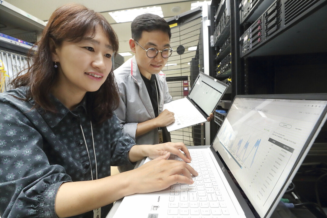 | KT 연구원들이 노트북 화면을 통해 AI 플로우 기술의 동작 여부를 모니터링 하고 있다. [사진=KT] |