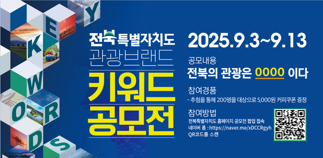 이정석 전북특별자치도 문화체육관광국장은 “이번 키워드 공모전은 도민과 관광객이 직접 참여해 전북 관광의 새로운 이미지를 함께 만들어가는 첫걸음”이라며 “누구나 공감할 수 있는 매력적인 브랜드를 구축해 전북관광의 경쟁력을 높이고 지역경제 활성화로 이어질 수 있도록 최선을 다하겠다”라고 말했다.