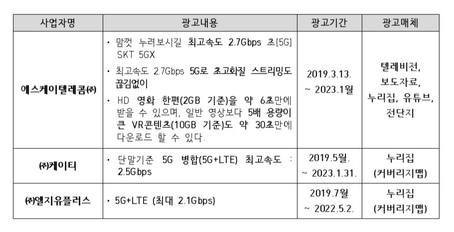 공정위에 따르면, 이통3사는 실제 사용환경에서는 구현될 수 없는 5G 기술표준상 목표속도인 20Gbps를 소비자가 이용할 수 있는 것처럼 광고했다. 이는 할당받은 주파수 대역 및 엄격한 전제 조건 하에서 계산되는 최대지원속도를 소비자가 실제 이용할 수 있는 것처럼 광고한 것이다.