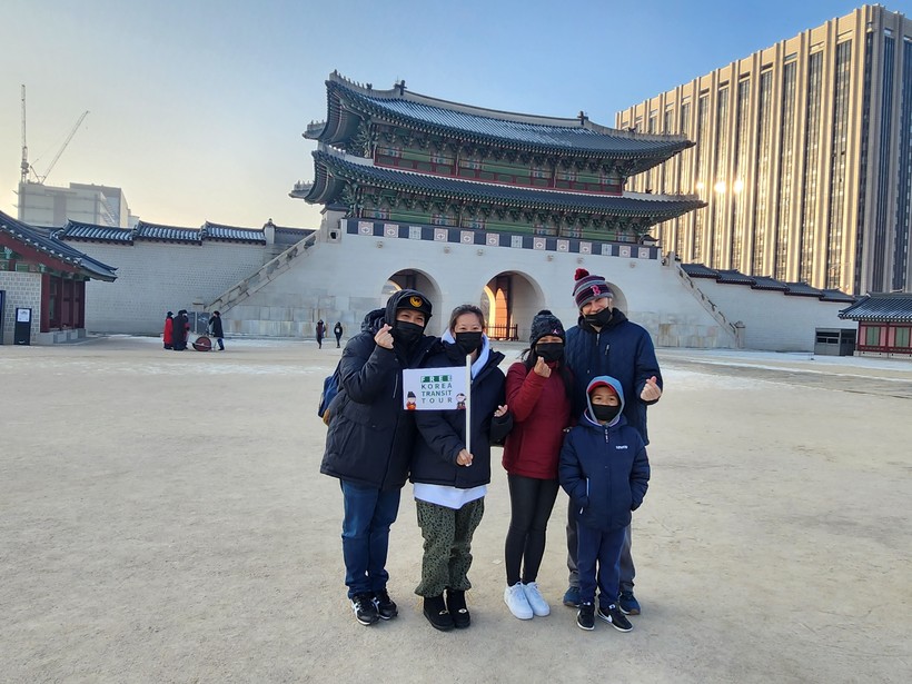 ▲ 인천국제공항공사가 지난 1일부터 인천공항 외부 환승투어를 재개했다. 사진은 지난 1일 전통테마 환승투어에 참여한 환승객들이 경복궁 앞에서 기념촬영을 하고 있는 모습. |
