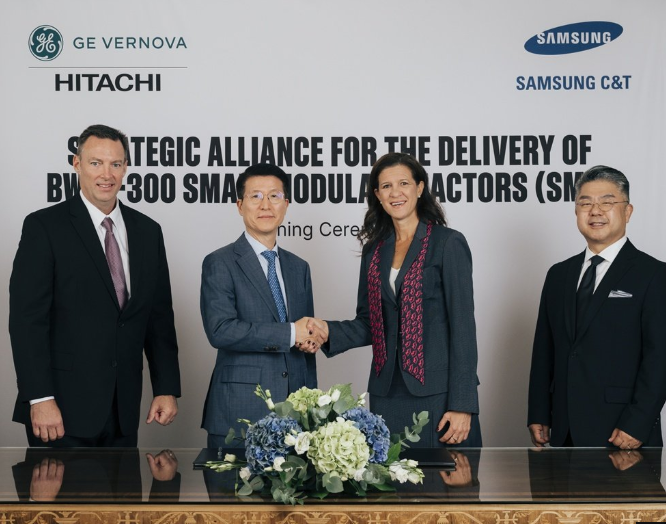 | 삼성물산-GVH SMR 파트너십 체결식 모습. 왼쪽부터 제이슨 쿠퍼 GVH SMR 부문 CEO, 오세철 삼성물산 오세철 대표이사, 마비 징고니 GE Vernova 전력 부문 CEO, 김정은 삼성물산 원전영업팀장. [사진=삼성물산] |