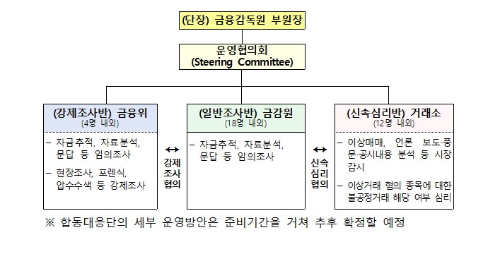 이에 금감원 부원장을 단장으로 하는 합동대응단을 설치해 거래소에 사무실을 두고 긴급·중요사건을 초기부터 함께 조사하며 신속 심리, 강제조사 필요성을 협의한다. 인원은 금융위 4명(강제조사반), 금감원 18명(일반조사반), 거래소 12명(신속심리반) 등 34명으로 출발한다.