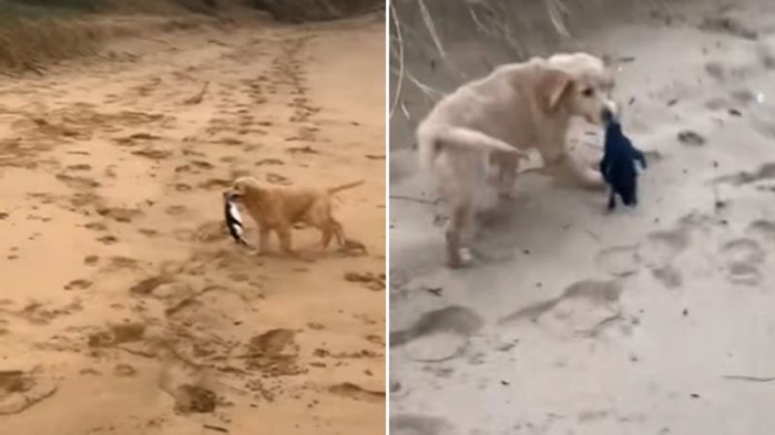 영상 공유 사이트인 틱톡(TikTok)에 게시된 영상에는 어린 골든 리트리버 한 마리가 해안가 근처에서 펭귄을 물고 뛰어가는 장면을 보여주고 있다.