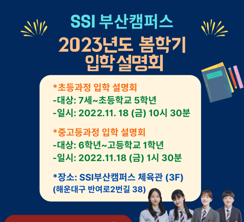 SSI 부산캠퍼스에서 진행하는 입학설명회는 18일 오전 10시30분 초등과정(7세~초5), 오후 1시30분에는 중·고등과정(초6~고1)으로 나누어 각각 진행된다.